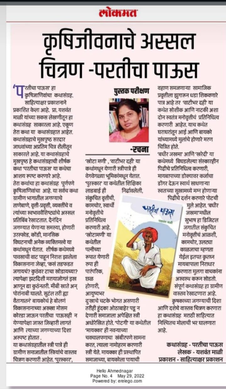 परतीचा पाऊस ' हा कृषिजाणिवांचा कथासंग्रह साहित्याक्षर प्रकाशनाने नुकताच प्रकाशित केला आहे. प्रा . यशवंत माळी यांच्या सकस लेखणीतून हा कथासंग्रह साकारला आहे. . एकूण तेरा कथा असलेला या कथासंग्रहात कथा या वाङ्मयप्रकाराची आगळी वैशिष्टये आपणांस दिसून येतात . कथासंग्रहाचे मुखपृष्ठ सरदार जाधवांच्या अप्रतिम चित्र शैलीतून साकारले आहे .